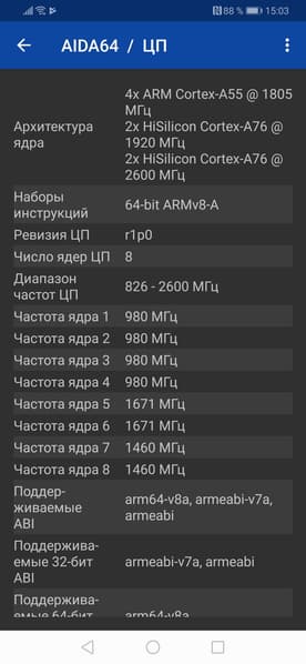 - SoC Huawei Kirin 980, 8 ядер: 2×Cortex-A76 @2,6 ГГц, 2×Cortex-A76 @1,9 ГГц, 4×Cortex-A55 @1,8 ГГц