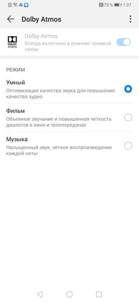 Что касается наушников, то для них 3,5-миллиметровый аудиовыход, к сожалению, не предусмотрели. Но зато аппарат поддерживает все кодеки для работы беспроводных наушников: aptX и aptX HD, LDAC HD, а также HWA Audio собственной разработки. Настройки Dolby Atmos позволяют внести изменения на собственный вкус, звучит в наушниках аппарат достойно.