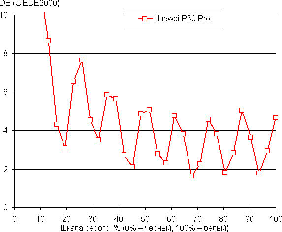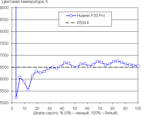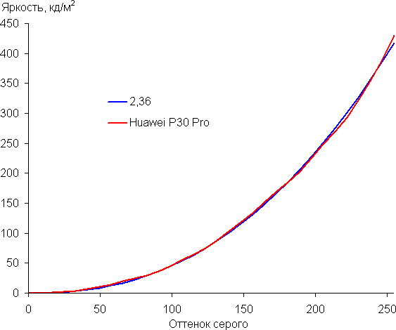 Напомним, что в случае OLED-экранов яркость фрагментов изображения динамично меняется в соответствии с характером выводимого изображения — немного уменьшается для светлых в целом изображений. В итоге полученная зависимость яркости от оттенка (гамма-кривая), скорее всего, не соответствует гамма-кривой статичного изображения, так как измерения проводились при последовательном выводе оттенков серого почти на весь экран.
