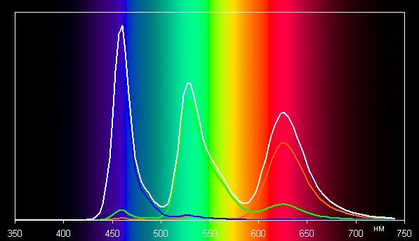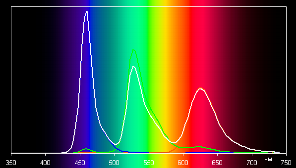 В случае профиля Обычные [цвета] баланс оттенков на шкале серого хороший, так как цветовая температура близка к стандартным 6500 К, и отклонение от спектра абсолютно черного тела (ΔE) ниже 10 единиц, что для потребительского устройства считается хорошим показателем. При этом вариация цветовой температуры не очень большая — это положительно сказывается на визуальной оценке цветового баланса. (Темные области шкалы серого можно не учитывать, так как там баланс цветов не имеет большого значения, да и погрешность измерений цветовых характеристик на низкой яркости большая.)