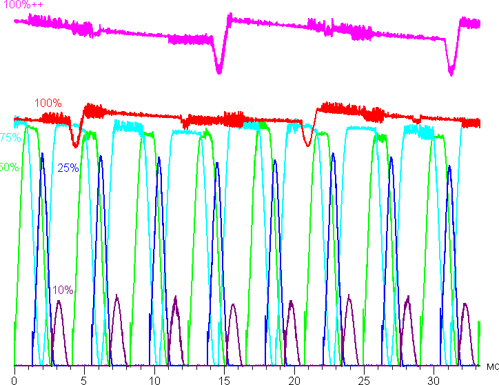 На среднем и низком уровне яркости появляется значимая модуляция с частотой 240 Гц. На рисунке ниже приведены зависимости яркости (вертикальная ось) от времени (горизонтальная ось) для нескольких значений настройки яркости (100%++ — это с дополнительной засветкой датчика освещенности ярким светом):