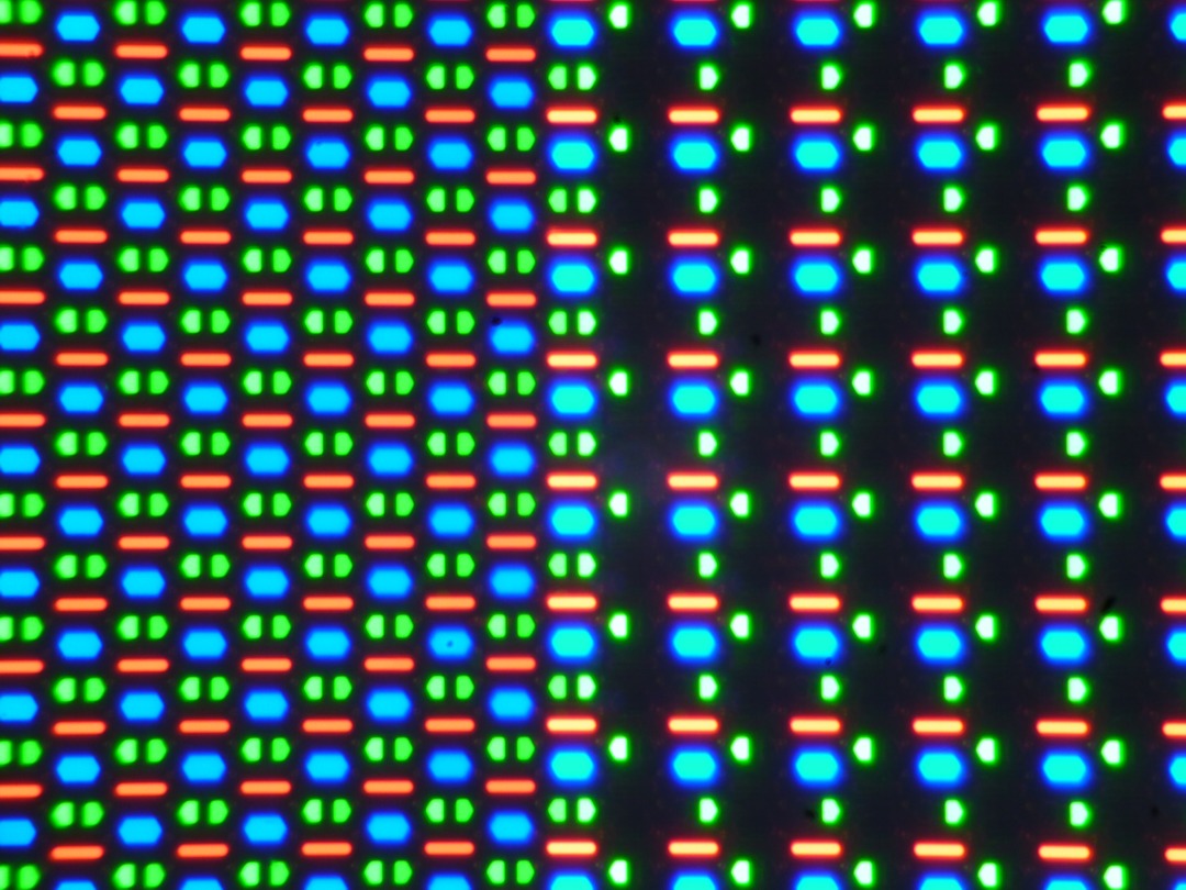 В этом экране используется матрица AMOLED — активная матрица на органических светодиодах. Полноцветное изображение создается с помощью субпикселей трех цветов — красного (R), зеленого (G) и синего (B), но красных и синих субпикселей в два раза меньше, что можно обозначить как RGBG. Это подтверждается фрагментом микрофотографии: