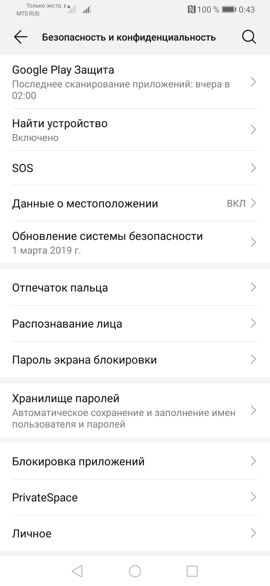 Имеется функция разблокировки по лицу, но в Huawei P30 Pro нет ни специального сканера радужной оболочки глаза, ни инфракрасной камеры. Поэтому функция разблокировки работает лишь с помощью фронтальной камеры. В темноте смартфон пытается поднимать яркость экрана, чтобы достаточно осветить лицо владельца и выполнить такую разблокировку, но обычно этот вариант не срабатывает — приходится использовать сканер отпечатков пальцев.