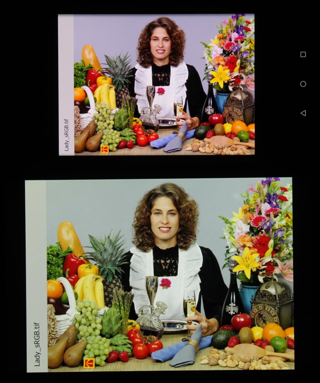 По критерию вывода кадров качество воспроизведения видеофайлов очень хорошее, так как кадры или группы кадров могут (но не обязаны) выводиться с равномерным чередованием интервалов и без пропусков. При воспроизведении видеофайлов с разрешением 1920 на 1080 пикселей (1080p) изображение собственно видеофайла выводится точно по высоте экрана (при ландшафтной ориентации) с интерполяцией к разрешению экрана, и конечно, часть картинки оказывается на загнутых краях с соответствующим искажением яркости и цвета. Можно переключиться в режим один-в-один по пикселям, тогда вывод будет в истинном разрешении Full HD и с минимальным заходом на загнутые края. Однако при этом уже проявляются особенности PenTile: вертикальная мира через пиксель в сеточку, но на горизонтальной нет привычной для PenTile зеленоватости. Это наблюдается на тестовых мирах, а на реальных кадрах описываемые артефакты в любом случае не видны. Отображаемый на экране диапазон яркости соответствует стандартному диапазону 16—235: в тенях и в светах отображаются все градации оттенков. Отметим, что в этом смартфоне есть поддержка аппаратного декодирования файлов H.265 с глубиной цвета 10 бит на цвет, при этом вывод градиентов на экран осуществляется с лучшим качеством, чем в случае 8-битных файлов (впрочем, это не доказательство истинного 10-битного вывода). Также поддерживается отображение файлов HDR (HDR10, HEVC).