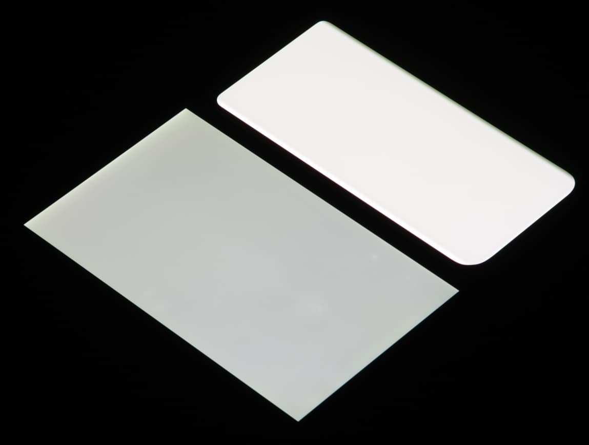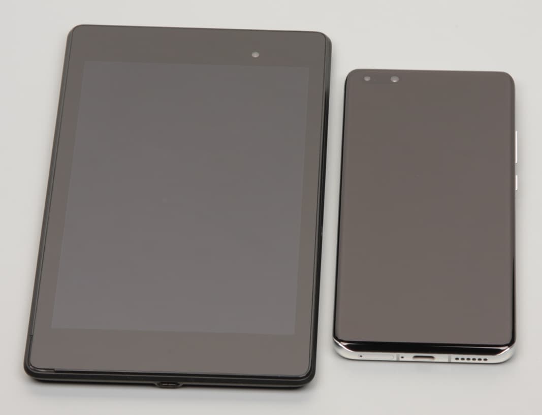 Лицевая поверхность экрана выполнена в виде стеклянной пластины с зеркально-гладкой поверхностью, устойчивой к появлению царапин. Судя по отражению объектов, антибликовые свойства экрана лучше, чем у экрана Google Nexus 7 (2013) (далее просто Nexus 7). Для наглядности приведем фотографию, на которой в выключенных экранах отражается белая поверхность (слева — Nexus 7, справа — Huawei P40 Pro, далее их можно различать по размеру):