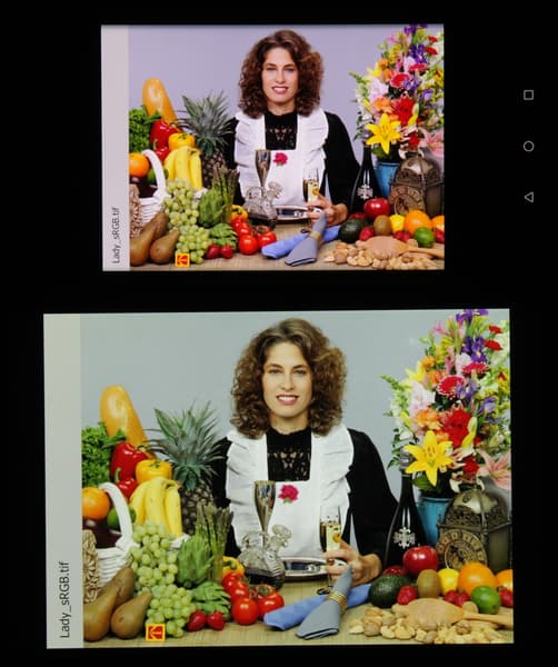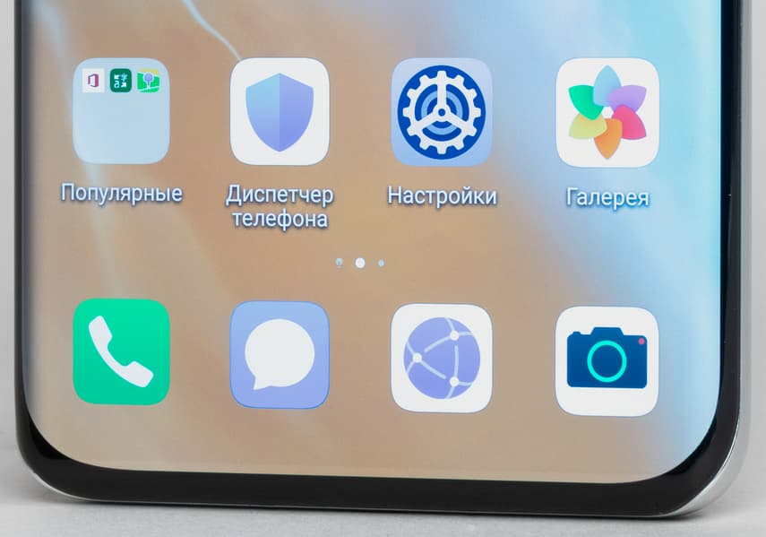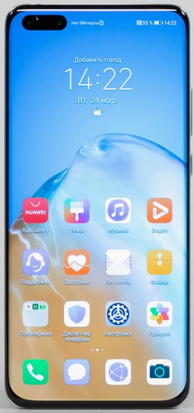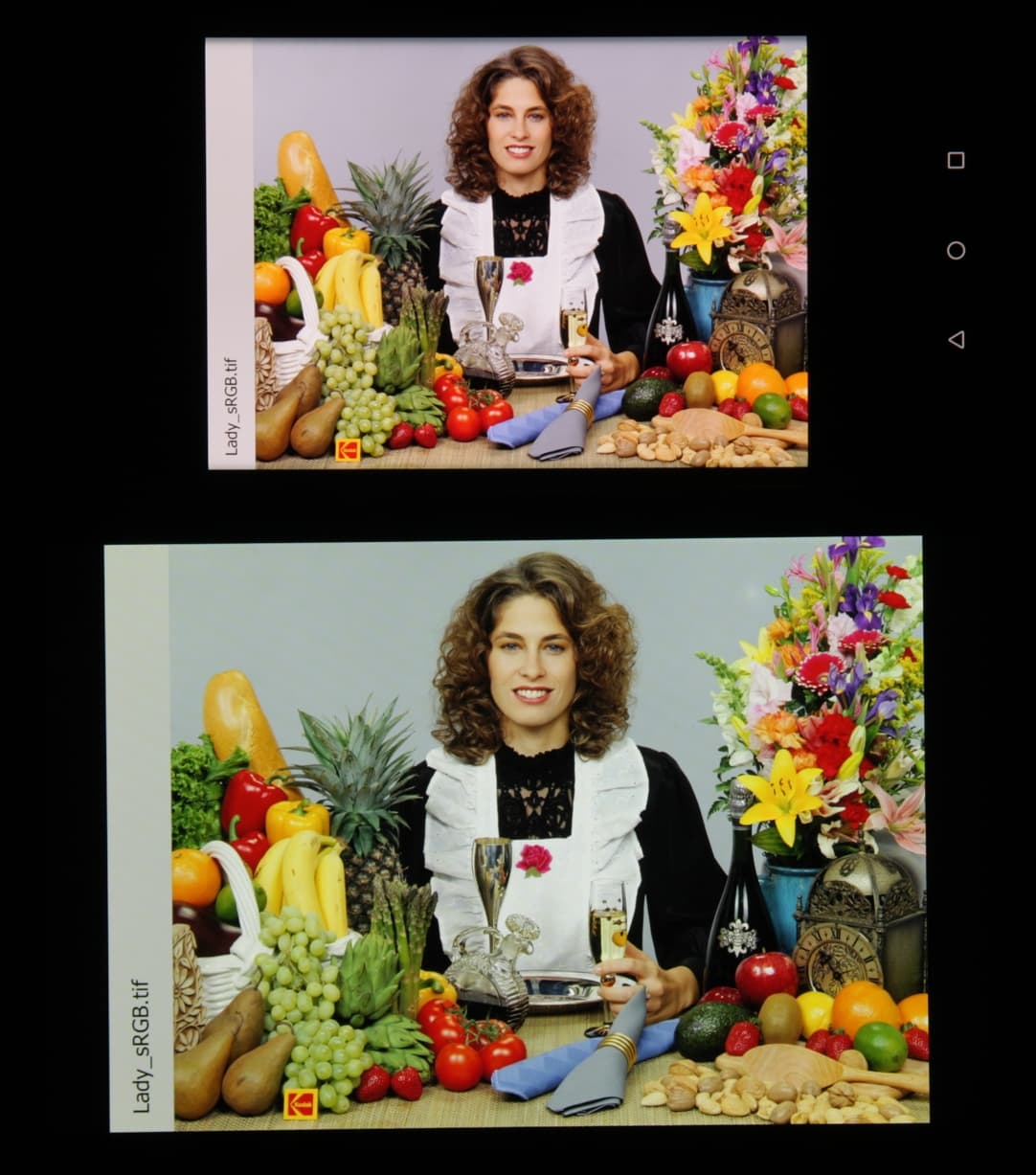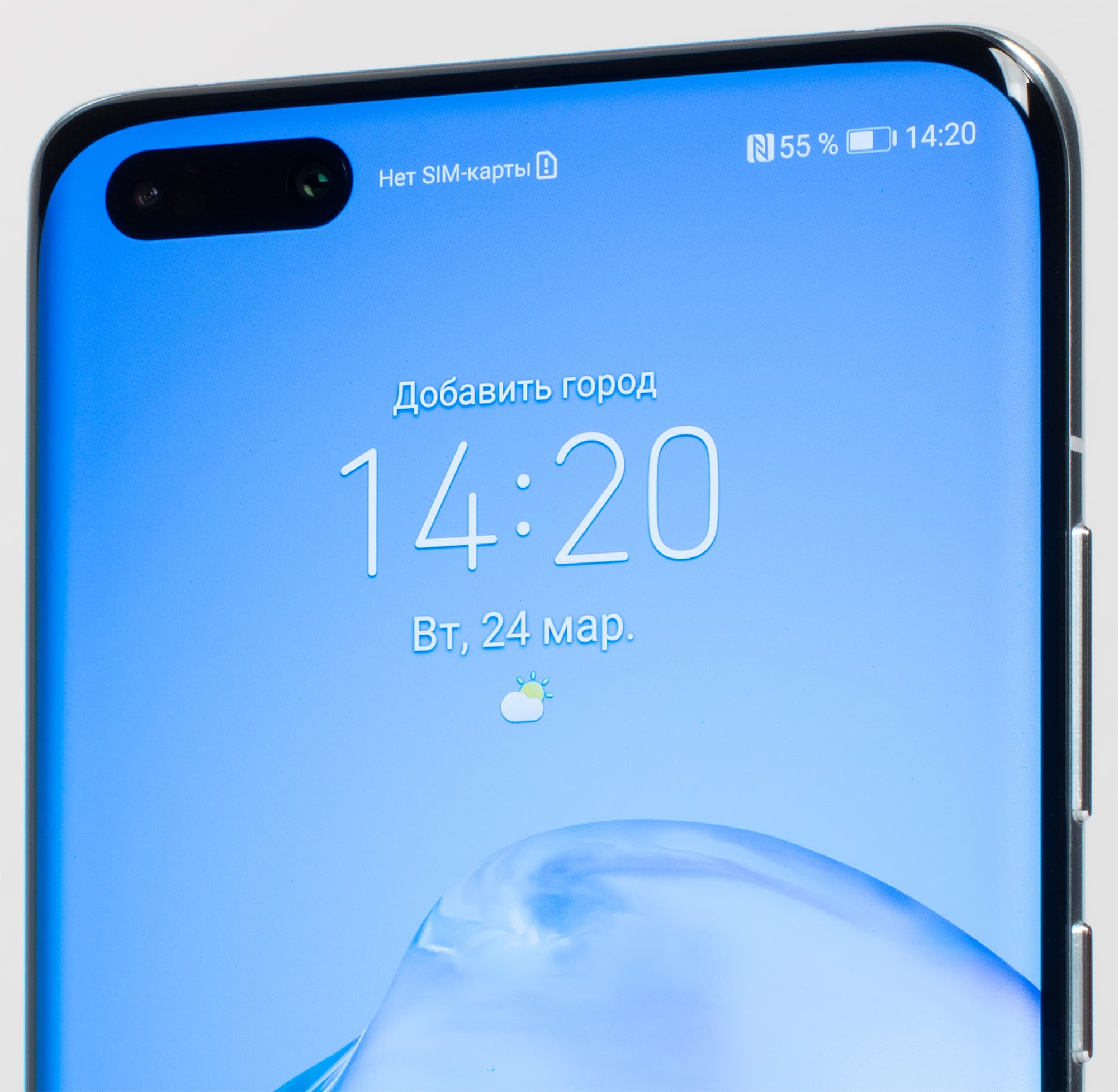 Цветопередача хорошая, цвета в меру насыщенные, цветовой баланс у экранов немного различается. Напомним, что фотография не может служить надежным источником сведений о качестве цветопередачи и приводится только для условной наглядной иллюстрации. В частности, выраженный красноватый оттенок белого и серого полей, присутствующий на фотографиях экрана Huawei P40 Pro, при перпендикулярном взгляде визуально отсутствует, что подтверждается аппаратными тестами с помощью спектрофотометра. Причина в том, что спектральная чувствительность матрицы фотоаппарата неточно совпадает с этой характеристикой человеческого зрения. Заметим, что в данном случае картинка занимает в высоту (при ландшафтной ориентации экрана) всю доступную для вывода изображения область и заходит на загнутые края экрана, что приводит к легкому затемнению и искажению цвета. Также на свету эти области почти всегда бликуют, что еще больше мешает при просмотре изображений, выведенных на весь экран. И даже картинка фильмов с соотношением сторон 16:9 заходит на загибы, что очень не к месту в случае видео.
