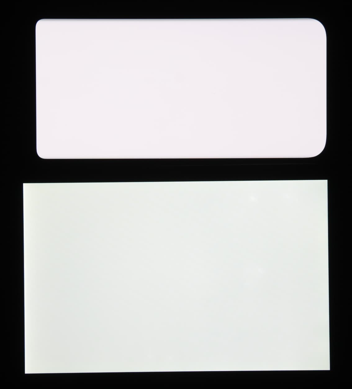 Экран характеризуется великолепными углами обзора. Даже белый цвет при отклонении меняет оттенок в очень малой степени, что для AMOLED-экранов редкость. Ну а черный цвет остается просто черным под любыми углами. Он настолько черный, что параметр контрастности в данном случае неприменим. Для сравнения приведем фотографии, на которых на экраны Huawei P40 Pro и второго участника сравнения выведены одинаковые изображения, при этом яркость экранов изначально установлена примерно на 200 кд/м², а цветовой баланс на фотоаппарате принудительно переключен на 6500 К.