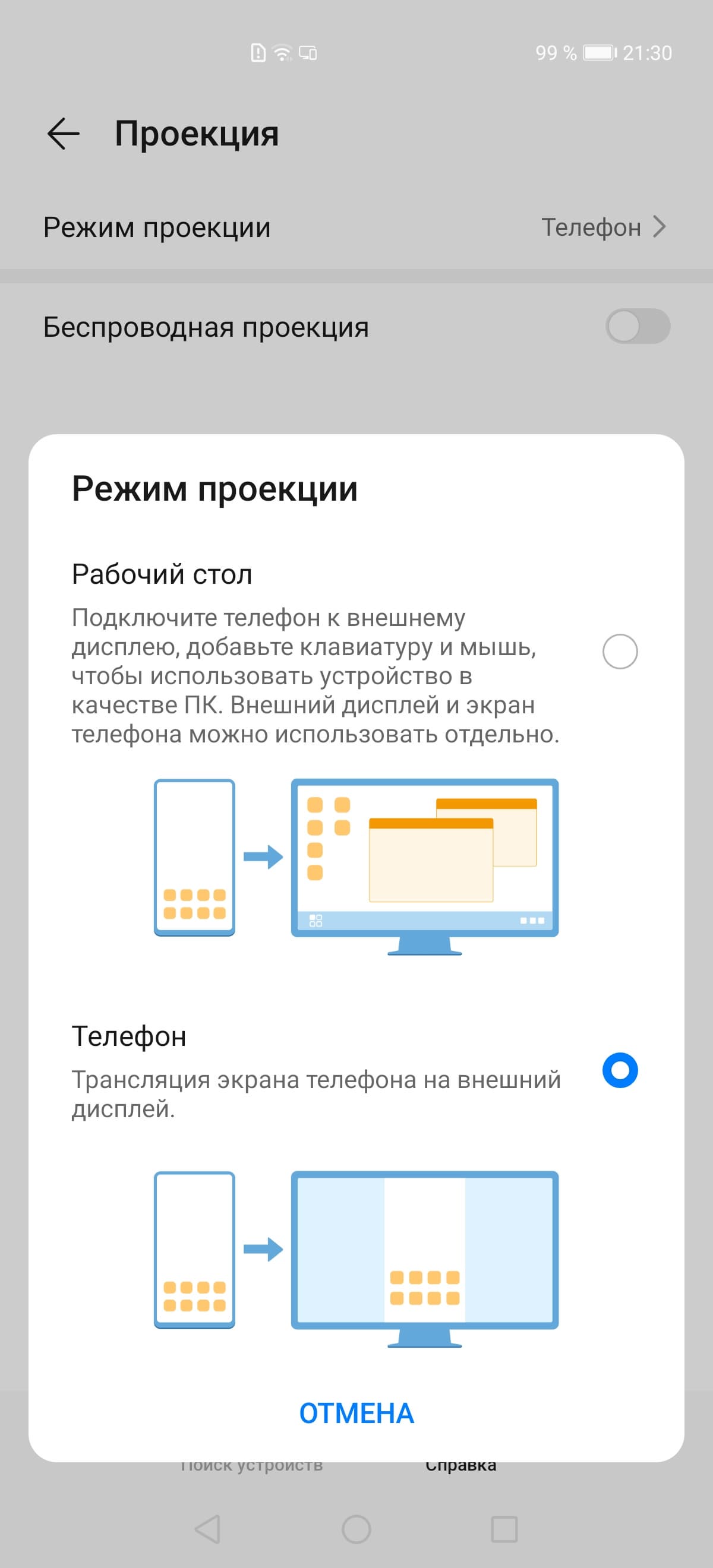Данный аппарат поддерживает DisplayPort Alt Mode для USB Type-C — вывод изображения и звука на внешнее устройство при подключении к порту USB (Отчет программы usbview.exe). Работу в таком режиме мы опробовали совместно с адаптером Dell DA200. При подключении к нашему монитору вывод видео осуществляется в режиме 1080p при 60 Гц кадровой частоты. Режимов работы два: вывод альтернативного рабочего стола (режим Рабочий стол) или простое копирование экрана смартфона (режим Телефон).