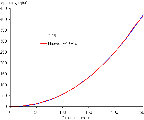 Напомним, что в случае OLED-экранов яркость фрагментов изображения динамично меняется в соответствии с характером выводимого изображения — чуть уменьшается для светлых в целом изображений. В итоге полученная зависимость яркости от оттенка (гамма-кривая), скорее всего, не соответствует гамма-кривой статичного изображения, так как измерения проводились при последовательном выводе оттенков серого почти на весь экран.