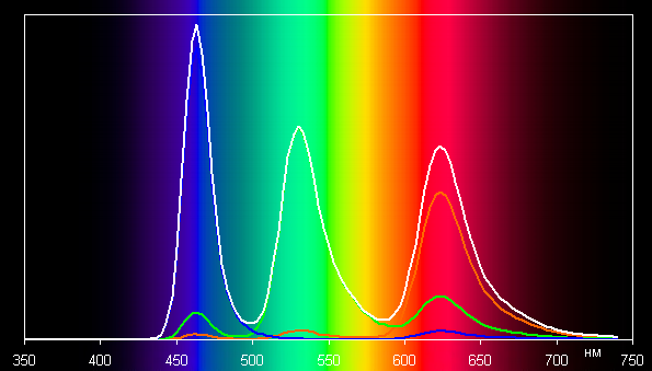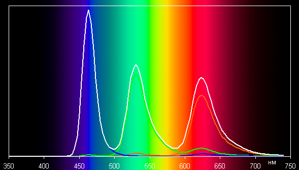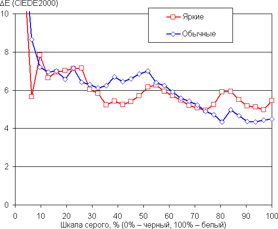В случае профиля Обычные баланс оттенков на шкале серого хороший, так как на цветовая температура близка к стандартным 6500 К, и отклонение от спектра абсолютно черного тела (ΔE) ниже 10, что для потребительского устройства считается неплохим показателем. При этом цветовая температура и ΔE мало изменяются от оттенка к оттенку — это положительно сказывается на визуальной оценке цветового баланса. (Самые темные области шкалы серого можно не учитывать, так как там баланс цветов не имеет большого значения, да и погрешность измерений цветовых характеристик на низкой яркости большая.)
