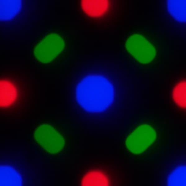 В этом экране используется матрица AMOLED — активная матрица на органических светодиодах. Полноцветное изображение создается с помощью субпикселей трех цветов — красного (R), зеленого (G) и синего (B), но красных и синих субпикселей в два раза меньше, что можно обозначить как RGBG. Это подтверждается фрагментом микрофотографии: