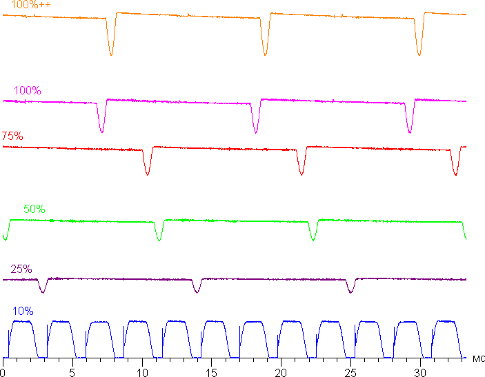 На любом уровне яркости присутствует значимая модуляция с частотой 60, 90 или 360 Гц. На рисунке ниже приведены зависимости яркости (вертикальная ось) от времени (горизонтальная ось) для нескольких значений настройки яркости. Сначала для режима с частотой обновления 60 Гц: