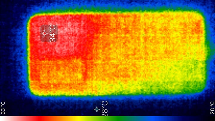 Нагрев больше в верхней левой части аппарата, что, видимо, соответствует расположению микросхемы SoC. По данным теплокамеры, максимальный нагрев составил всего 34 градуса (при температуре окружающего воздуха 24 градуса), это относительно немного.