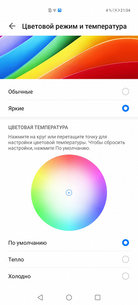 В этом устройстве есть возможность скорректировать цветовой баланс с помощью выбора профиля цветовой температуры или регулировки оттенка на цветовом круге, но с практической точки зрения смысла делать корректировку нет, достаточно выбрать профиль Обычные.