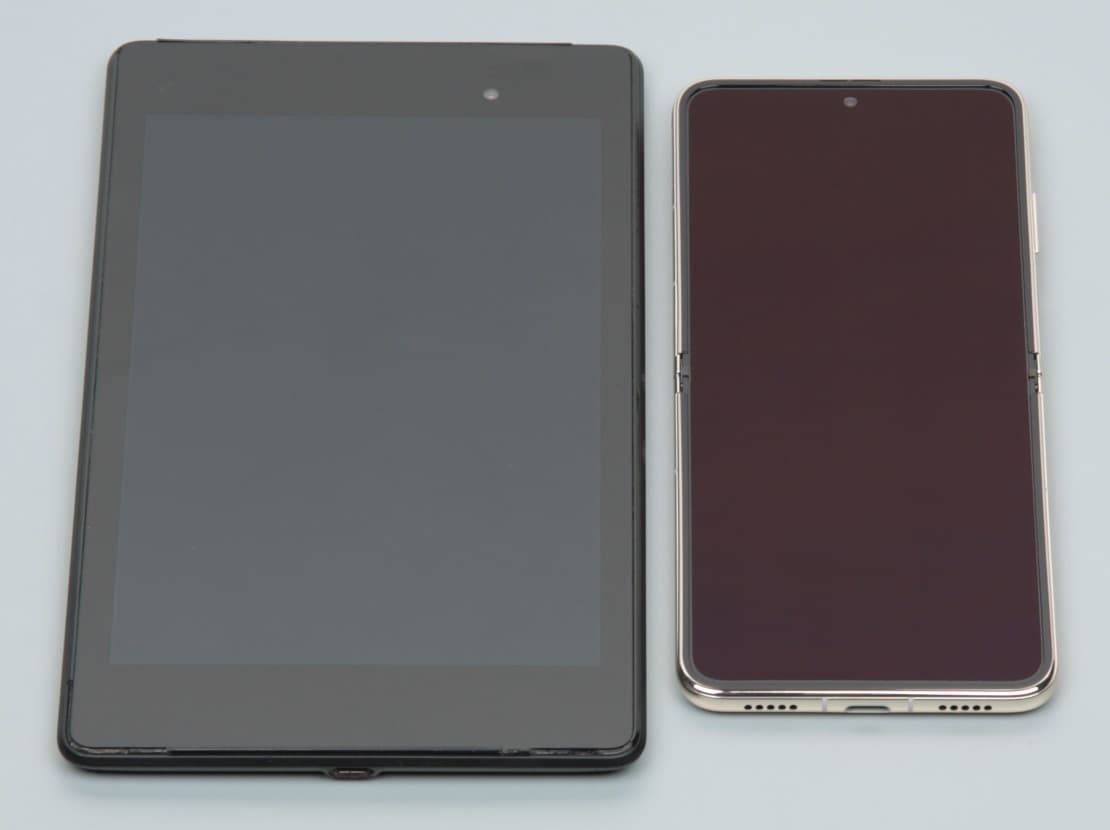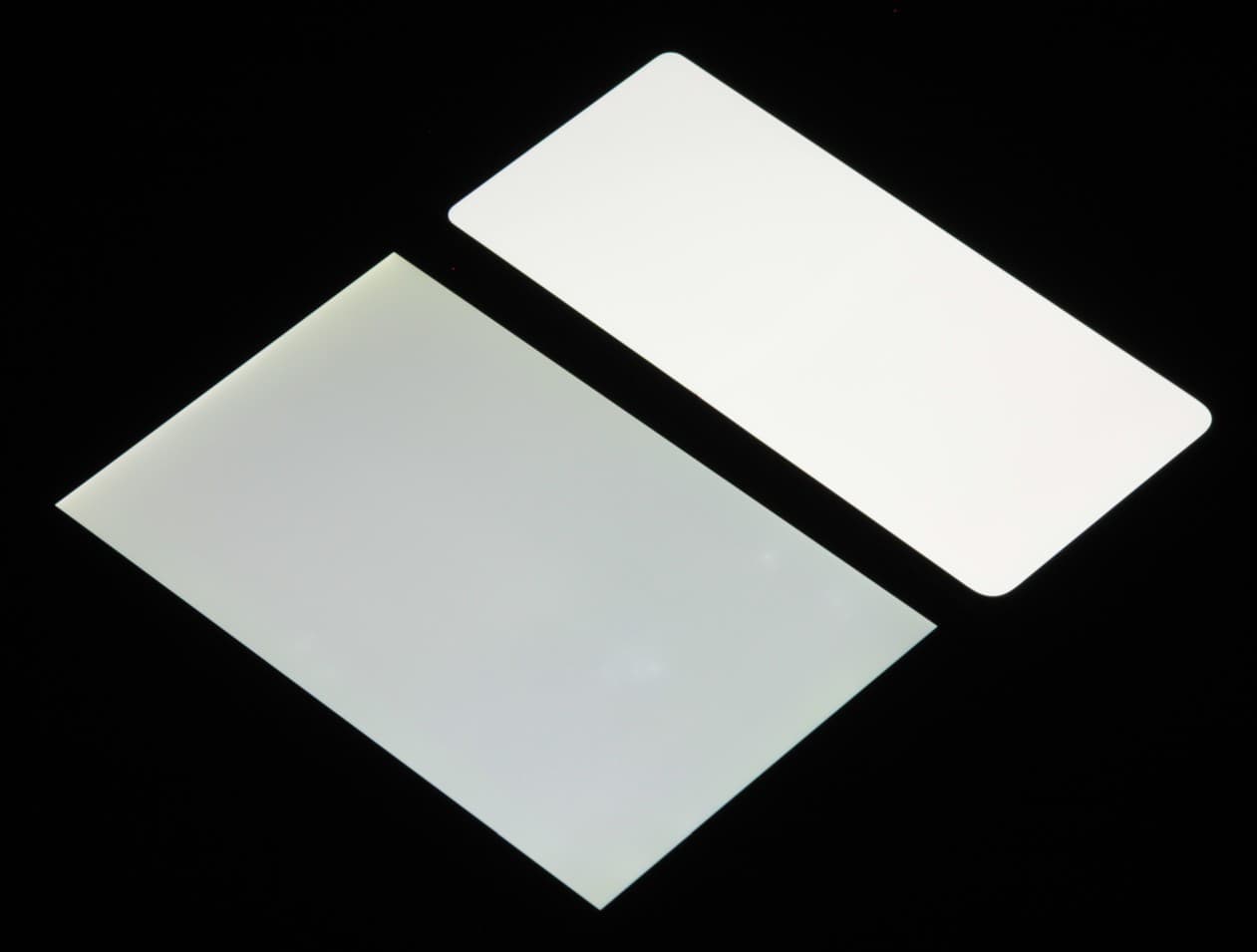 Лицевая поверхность большого раскладывающегося экрана выполнена из пластика. Дополнительно на экран наклеена защитная пленка, удаление которой запрещено, то есть она является частью экрана. Поверхность пленки относительно устойчива к появлению царапин, по крайней мере, поцарапать ее ногтем не получилось. Поверхность гибкого экрана глянцевая и слегка неровная по всей площади, а в месте сгиба есть едва выраженная складка. Впрочем, это практически никак не сказывается на изображении, если смотреть на экран более-менее перпендикулярно к его поверхности. Внешняя поверхность небольшого дополнительного экрана — это стеклянная пластина с зеркально-гладкой поверхностью, устойчивой к появлению царапин. Судя по отражению объектов, антибликовые свойства малого экрана немного лучше, а большого гораздо лучше, что и у экрана Google Nexus 7 (2013) (далее просто Nexus 7). Для наглядности приведем фотографию, на которой в выключенном экране отражается белая поверхность (слева — Nexus 7, справа — Huawei P50 Pocket Premium Edition, далее их можно различать по размеру):