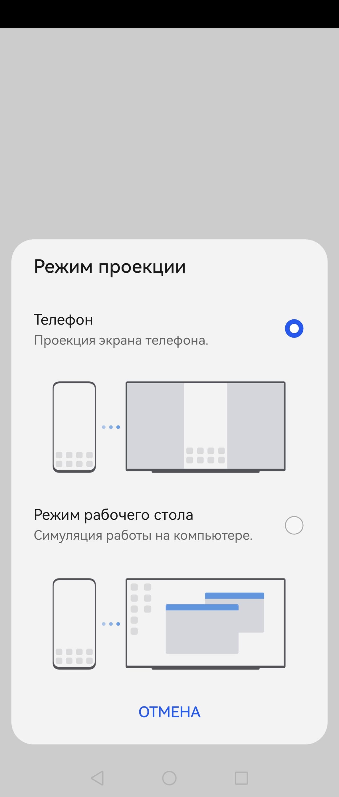 Во втором случае при портретной ориентации экрана смартфона картинка на экране ТВ выводится вписанной по высоте и с широкими черными полями по бокам, а при ландшафтной — вписанной по ширине с узкими черными полями сверху и снизу. Вывода точка в точку в обоих вариантах нет.