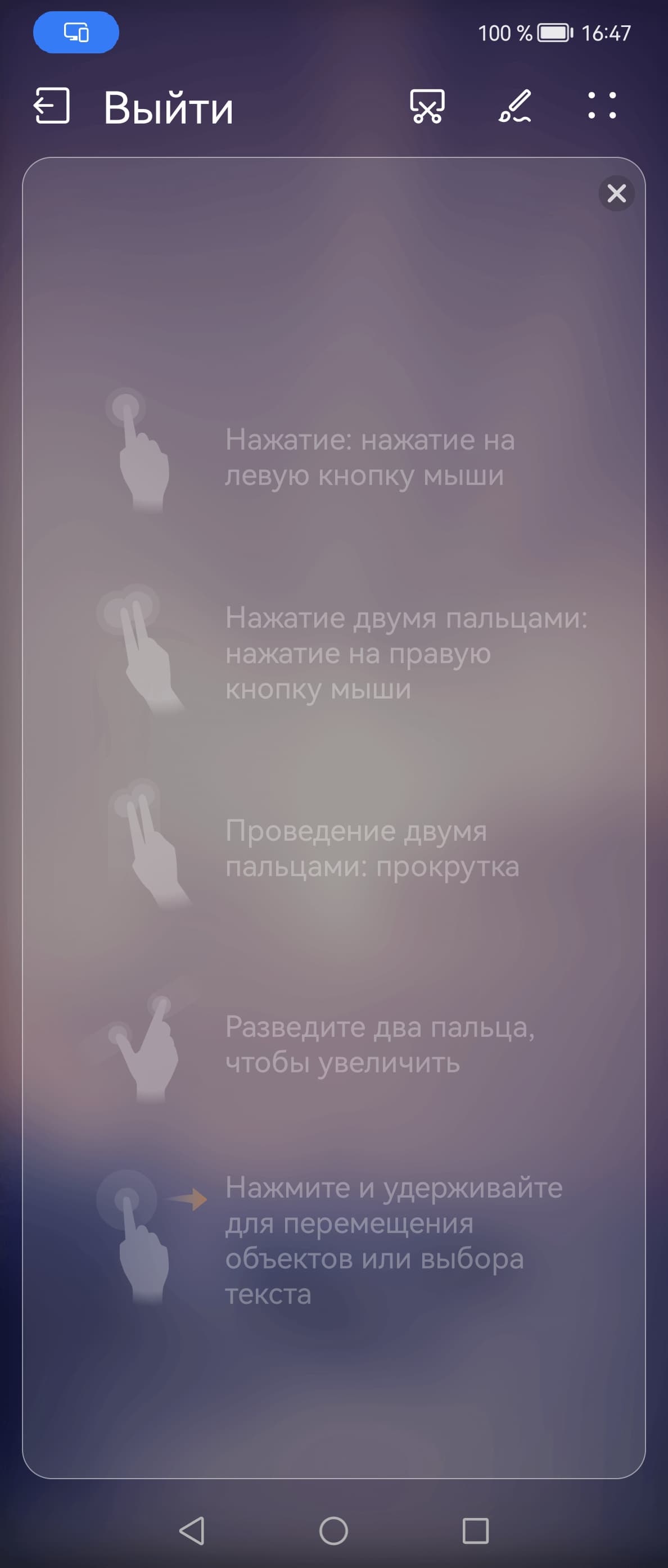 В режиме альтернативного рабочего стола на монитор выводится совершенно другой основной экран, а экран смартфона может использоваться в качестве сенсорной панели координатного ввода,