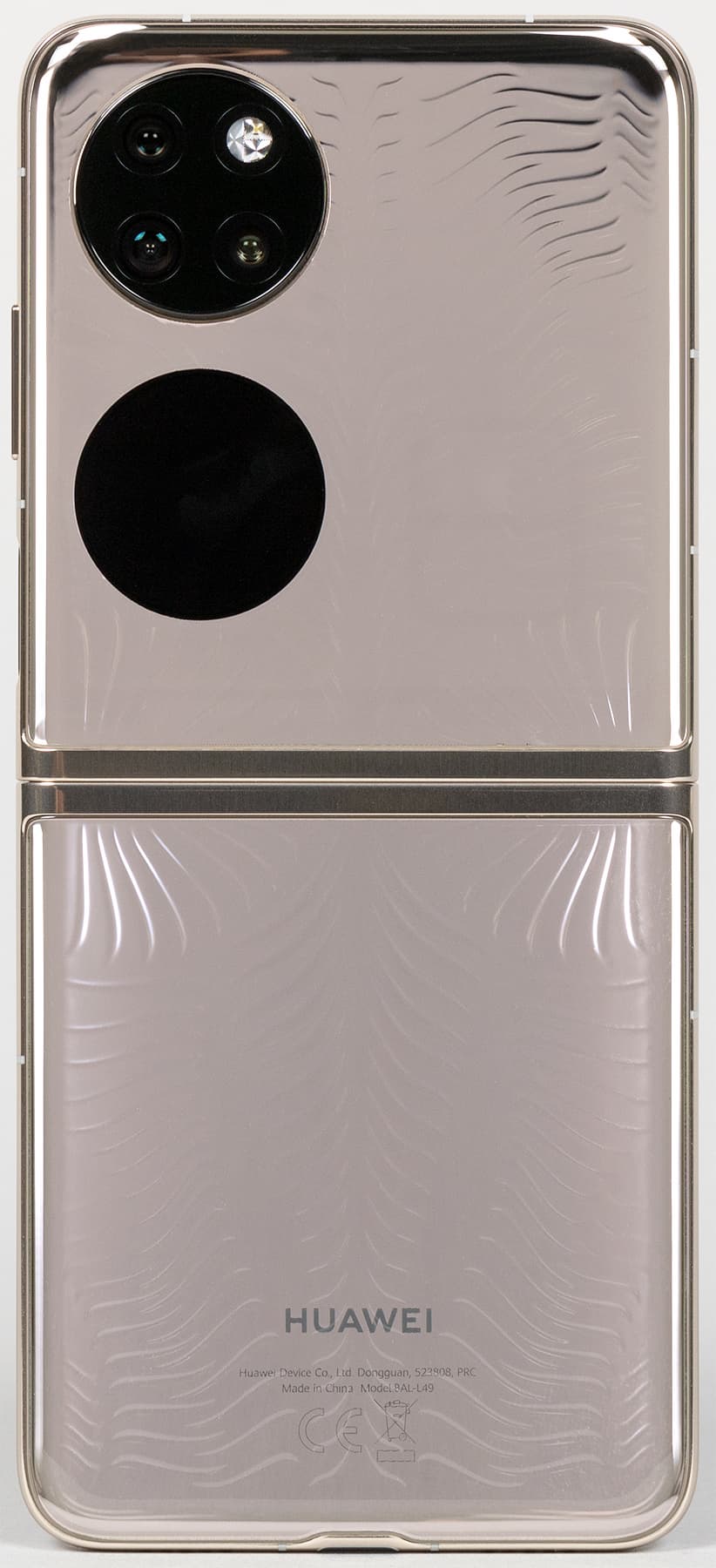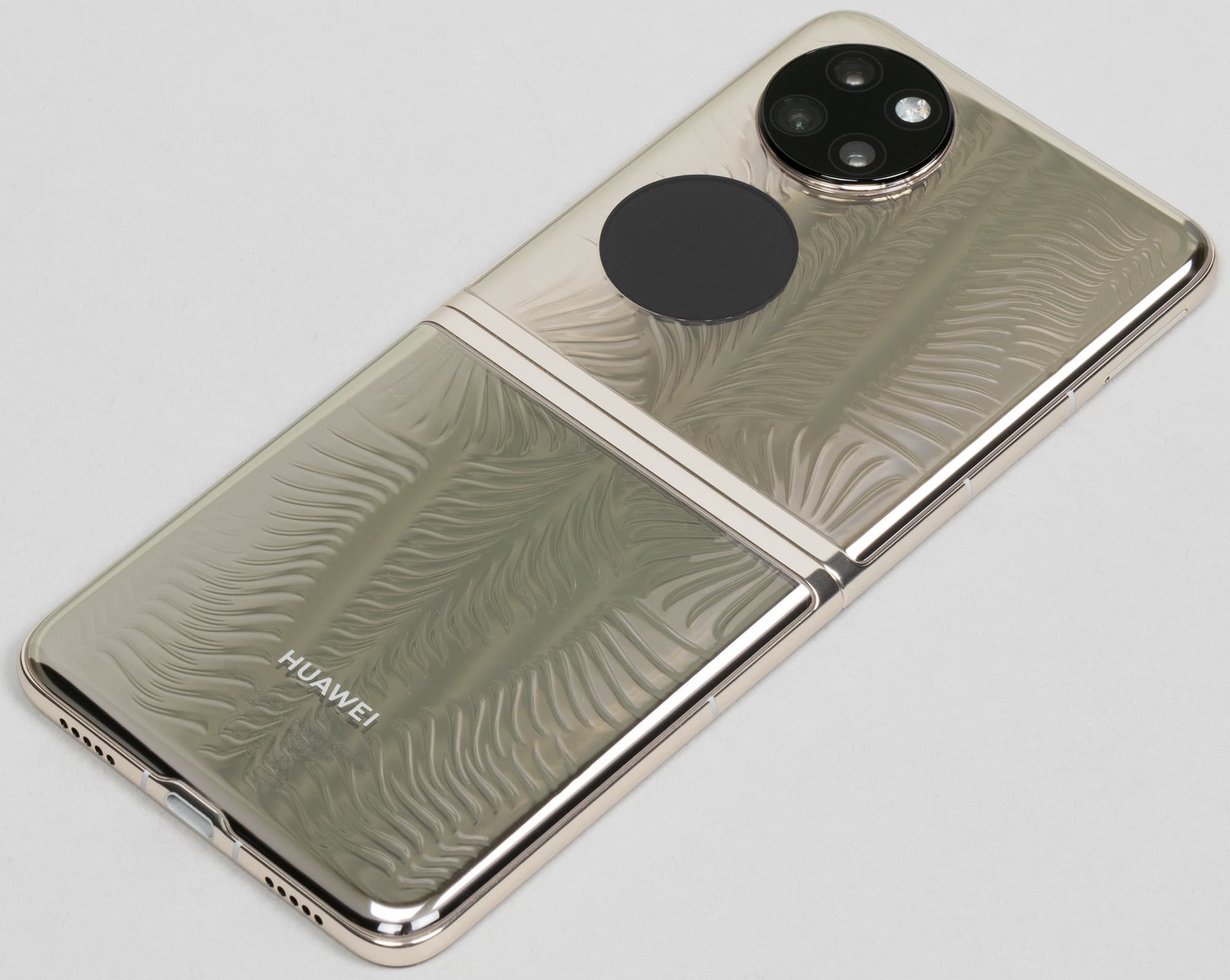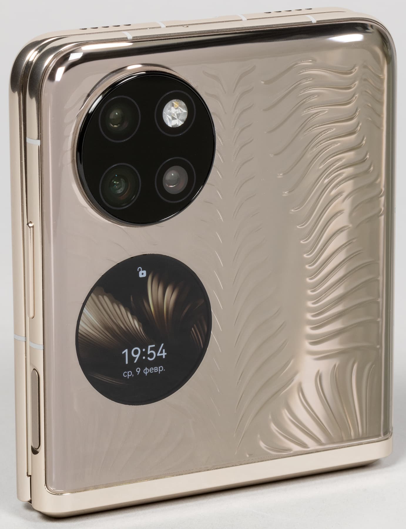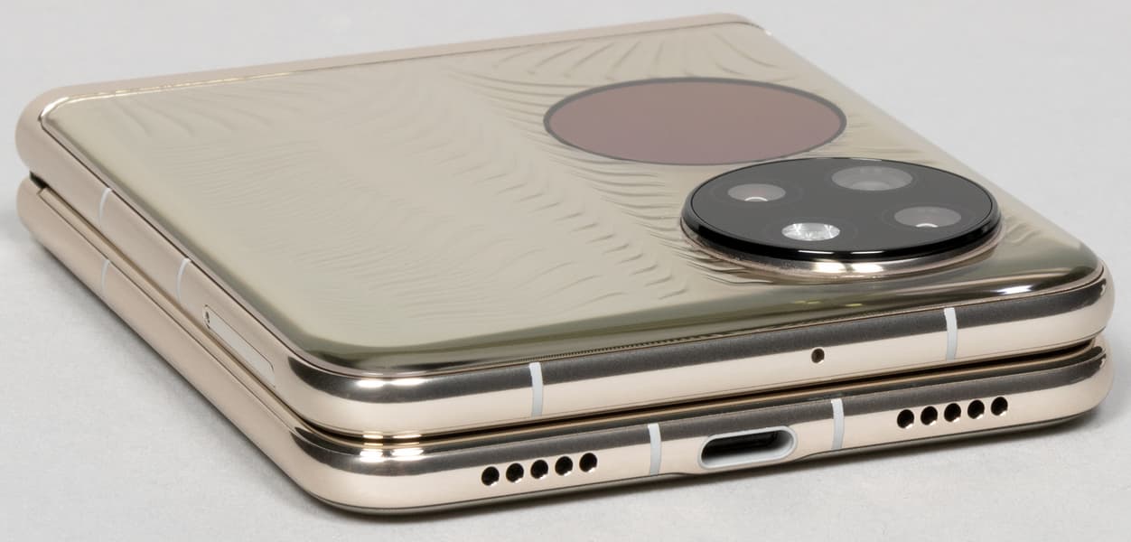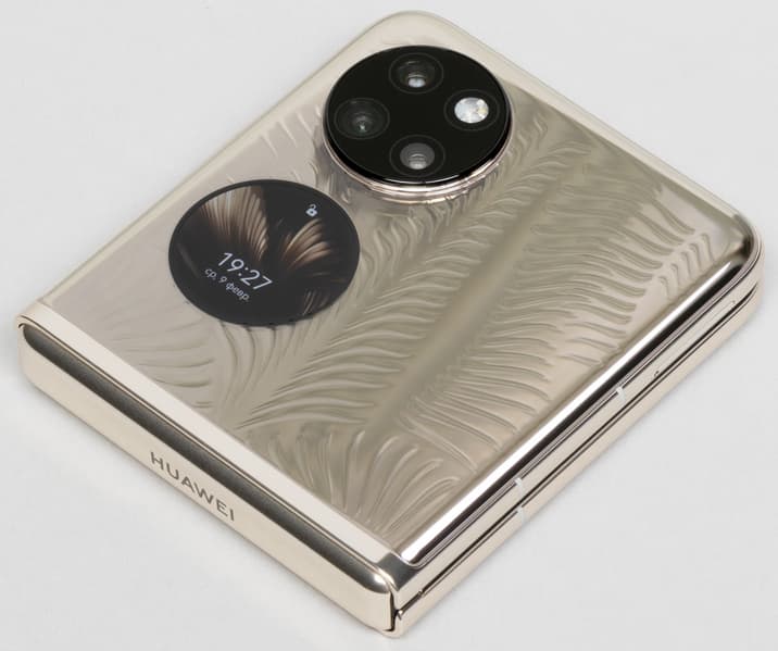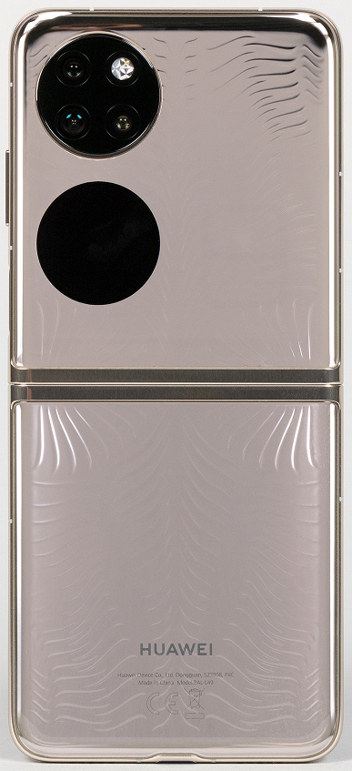 Корпус модели Huawei P50 Pocket Premium Edition формирует массивный металлический каркас с двумя прозрачными накладками на половинках, которые выполнены из стекла (или похожего на него материала). Под накладками поблескивает металлическая подложка, а на них самих присутствуют выступающие текстурированные узоры, хорошо ощутимые тактильно.
