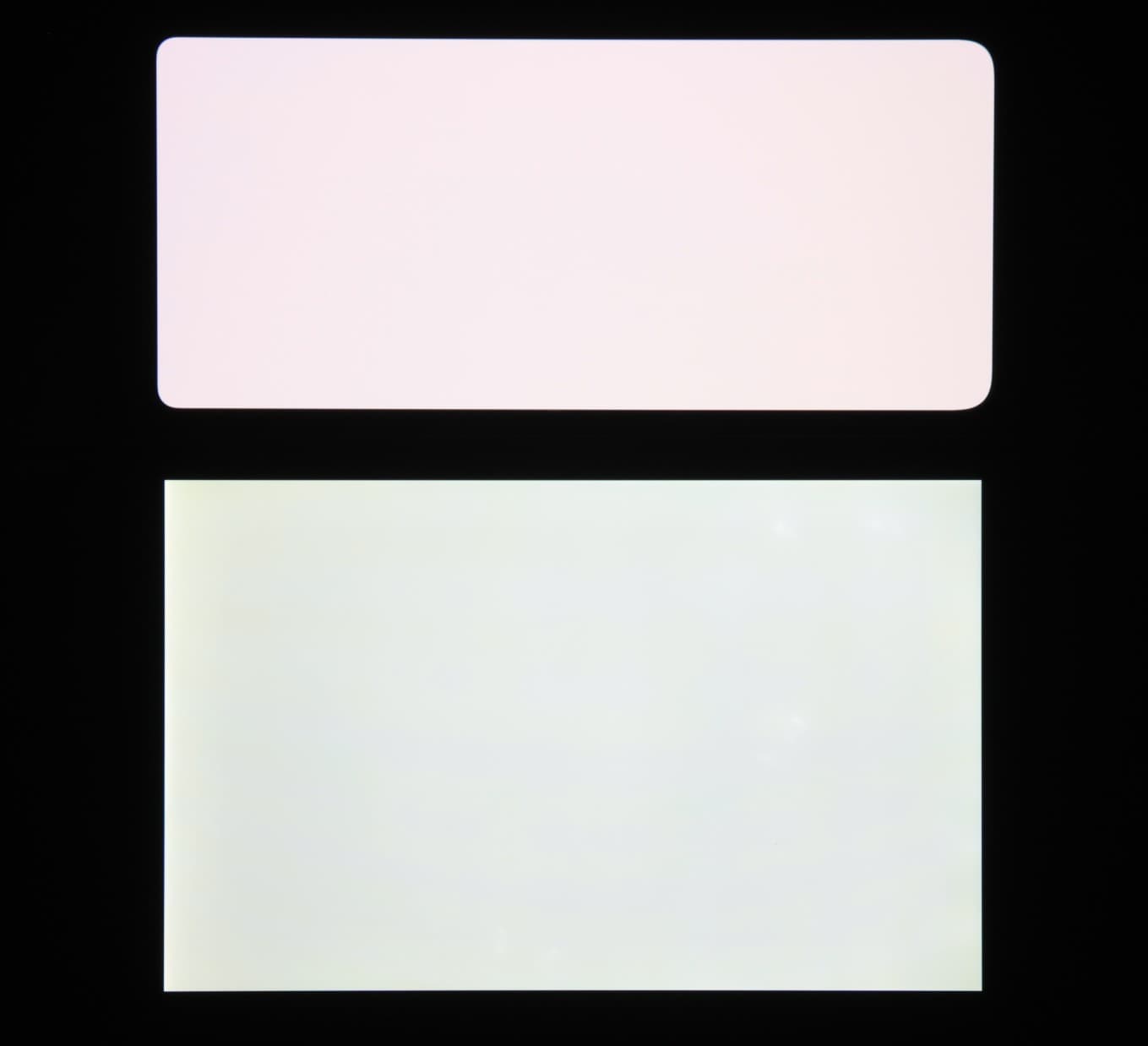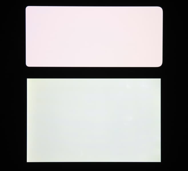 Оба экрана характеризуются великолепными углами обзора. Даже белый цвет при отклонении меняет оттенок лишь в малой степени, что для AMOLED-экранов редкость. А черный цвет остается просто черным под любыми углами. Он настолько черный, что параметр контрастности в данном случае неприменим. Для сравнения приведем фотографии, на которых на основной экран Huawei P50 Pocket Premium Edition и на экран второго участника сравнения выведены одинаковые изображения, при этом яркость экранов изначально установлена примерно на 200 кд/м², а цветовой баланс на фотоаппарате принудительно переключен на 6500 К.