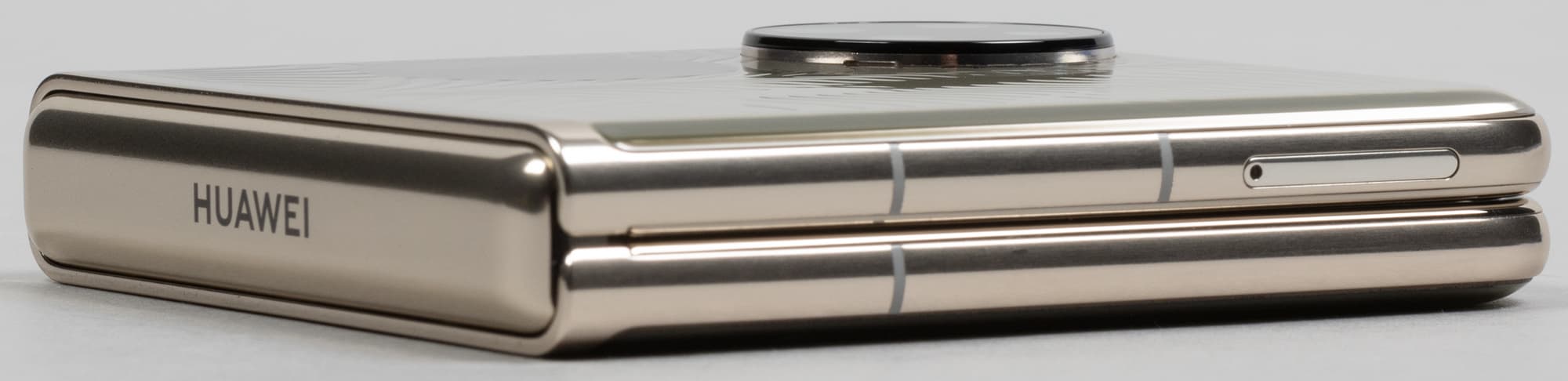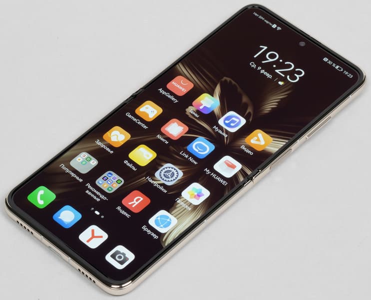 В раскрытом состоянии по расположению элементов на корпусе аппарат ничем не отличается от обычных смартфонов. Обе клавиши расположены на одной боковой грани. Грани сделаны округлыми и максимально скользкими — у Huawei с этим постоянно что-то не так: смартфон практически невозможно крепко удерживать в руке, он ощущается куском мыла. Аппарат норовит выскользнуть и в раскрытом состоянии, а особенно осторожным приходится быть при раскрытии половинок. К тому же тяжелые половинки не расхлопываются самостоятельно, их необходимо вручную разводить почти до самого конца.