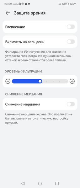 Разумеется есть функция снижения интенсивности синей компоненты (снимок экрана с настройкой был выше). В ее описании, конечно, приведена дезинформация про УФ-излучение и усталость глаз. В принципе, яркий свет может приводить к нарушению суточного (циркадного) ритма (см. статью про iPad Pro с дисплеем 9,7 дюйма), но все решается снижением яркости до низкого, но еще комфортного уровня, а искажать цветовой баланс, уменьшая вклад синего, нет абсолютно никакого смысла.