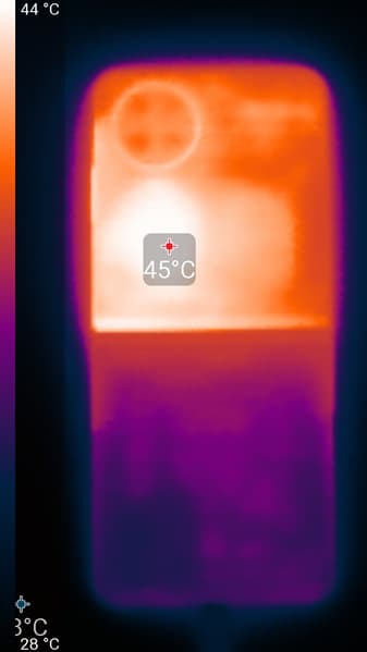 Нагрев больше в верхней части аппарата, что, видимо, соответствует расположению микросхемы SoC. По данным теплокамеры, максимальный нагрев составил 45 градусов (при температуре окружающего воздуха в 24 градуса), это существенно выше среднего значения для данного теста среди современных смартфонов.