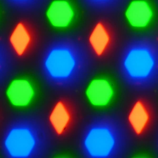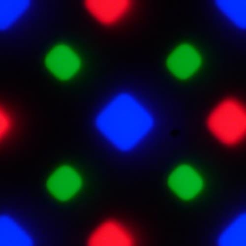 В этом экране используется матрица AMOLED — активная матрица на органических светодиодах. Полноцветное изображение создается с помощью субпикселей трех цветов — красного (R), зеленого (G) и синего (B), но красных и синих субпикселей в два раза меньше, что можно обозначить как RGBG. Это подтверждается фрагментом микрофотографии: