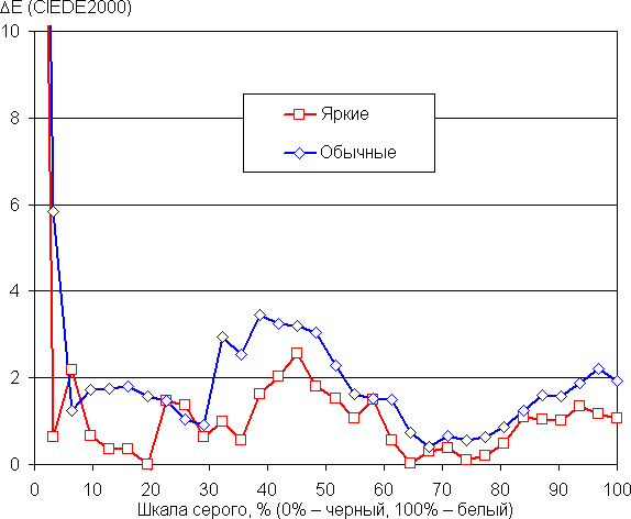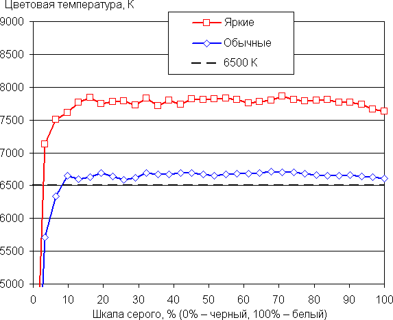 Впрочем, в случае профиля Обычные даже без коррекции баланс оттенков на шкале серого хороший, так как цветовая температура немного выше стандартных 6500 К, и отклонение от спектра абсолютно черного тела (ΔE) ниже 10 единиц, что для потребительского устройства считается хорошим показателем. При этом цветовая температура и ΔE мало изменяются от оттенка к оттенку — это положительно сказывается на визуальной оценке цветового баланса. (Самые темные области шкалы серого можно не учитывать, так как там баланс цветов не имеет большого значения, да и погрешность измерений цветовых характеристик на низкой яркости большая.)