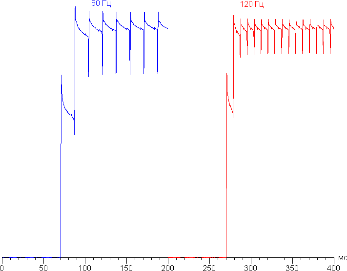 В режиме 120 Гц плавность прокрутки заметно повышается. Посмотрим, изменится ли при этом характер модуляции: