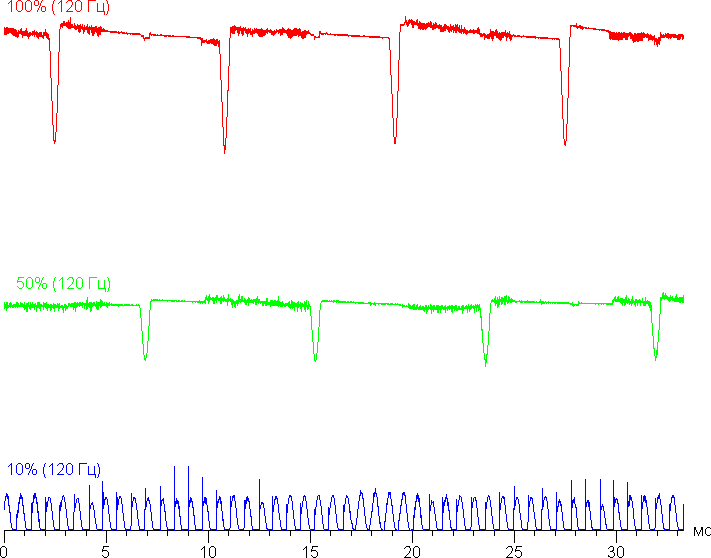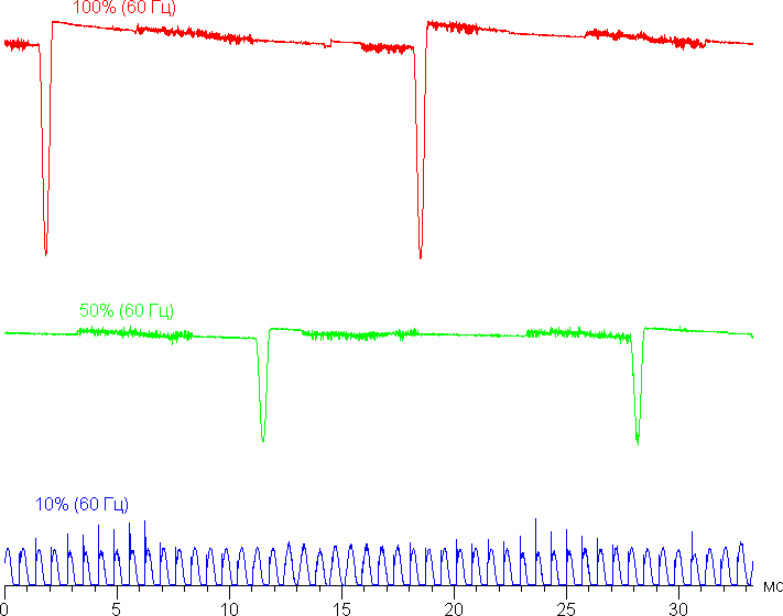На высоком и среднем уровне яркости присутствует значимая модуляция с частотой примерно 60 или 120 Гц. На рисунке ниже приведены зависимости яркости (вертикальная ось) от времени (горизонтальная ось) для нескольких значений настройки яркости. Сначала для режима с частотой обновления 60 Гц: