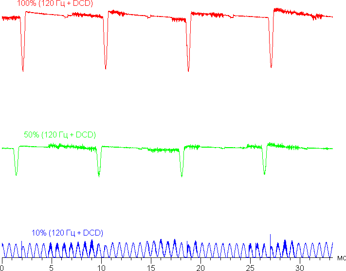 При включении функции Снижение мерцания на низкой яркости характер модуляции немного изменяется, но на заметности мерцания это не сказывается — его все так же не видно.
