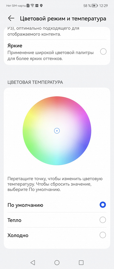 В этом устройстве есть возможность скорректировать цветовой баланс с помощью выбора профиля цветовой температуры или регулировки оттенка на цветовом круге (см. снимки выше).
