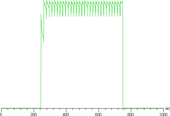 Переключение состояния элементов матрицы выполняется практически мгновенно, но на фронте включения (и реже выключения) может присутствовать ступенька шириной примерно 17 мс (что соответствует частоте обновления экрана). Например, так выглядит зависимость яркости от времени при переходе от черного к белому и обратно: