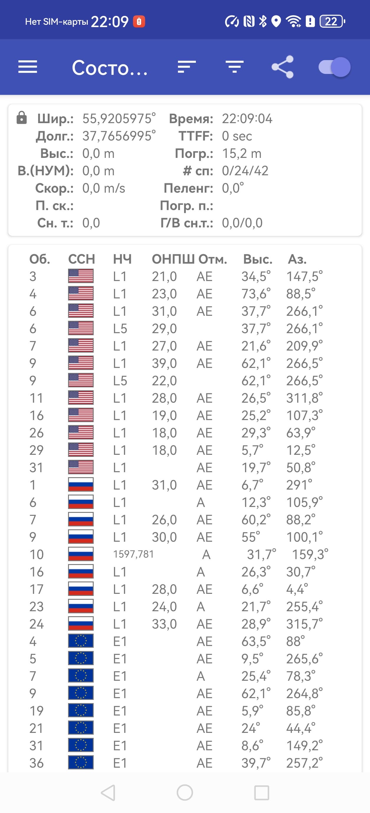 - GPS (L1+L5), Глонасс (L1), BDS (B1I+B1c+B2a+B2b), Galileo (E1+E5a+E5b), QZSS (L1+L5), NavIC