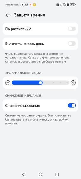 Разумеется есть функция снижения интенсивности синей компоненты. В описании режима Защита зрения приведена дезинформация про усталость глаз. В принципе, яркий свет может приводить к нарушению суточного (циркадного) ритма (см. статью про iPad Pro с дисплеем 9,7 дюйма), но все решается снижением яркости до низкого, но еще комфортного уровня, а искажать цветовой баланс, уменьшая вклад синего, нет абсолютно никакого смысла.