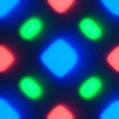 На фрагменте выше можно насчитать 4 зеленых субпикселя, 2 красных (4 половинки) и 2 синих (1 целый и 4 четвертушки), при этом, повторяя эти фрагменты, можно выложить весь экран без разрывов и перехлеста. Для таких матриц компания Samsung ввела наименование PenTile RGBG. Разрешение экрана производитель считает по зеленым субпикселям, по двум другим оно будет ниже. Разумеется, присутствуют некоторая неровность контрастных границ и другие артефакты. Впрочем, из-за высокого разрешения они лишь минимально сказываются на качестве изображения.