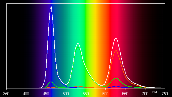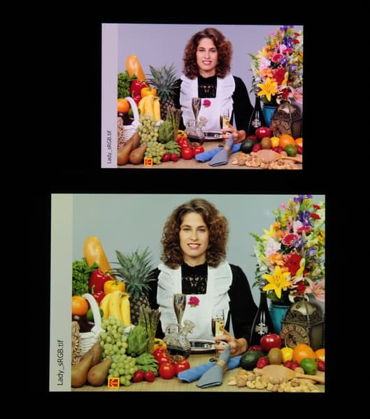 В этом устройстве есть возможность скорректировать цветовой баланс с помощью выбора профиля цветовой температуры или регулировки оттенка на цветовом круге. Впрочем, в случае профиля Обычные цвета даже без коррекции баланс оттенков на шкале серого хороший, так как цветовая температура достаточно близка к стандартным 6500 К, а отклонение от спектра абсолютно черного тела (ΔE) ниже 10, что для потребительского устройства считается хорошим показателем. При этом цветовая температура и ΔE мало изменяются от оттенка к оттенку — это положительно сказывается на визуальной оценке цветового баланса. (Самые темные области шкалы серого можно не учитывать, так как там баланс цветов не имеет большого значения, да и погрешность измерений цветовых характеристик на низкой яркости большая.)