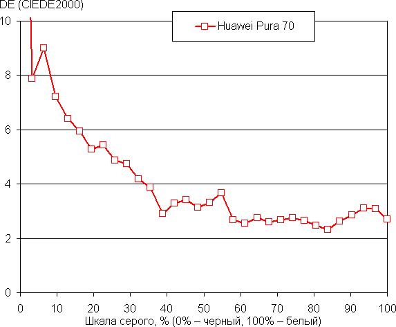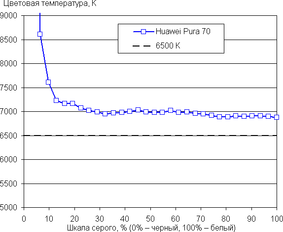 Напомним, что в случае OLED-экранов яркость фрагментов изображения динамично меняется в соответствии с характером выводимого изображения — чуть уменьшается для светлых в целом изображений. В итоге полученная зависимость яркости от оттенка (гамма-кривая), скорее всего, не соответствует гамма-кривой статичного изображения, так как измерения проводились при последовательном выводе оттенков серого почти на весь экран.