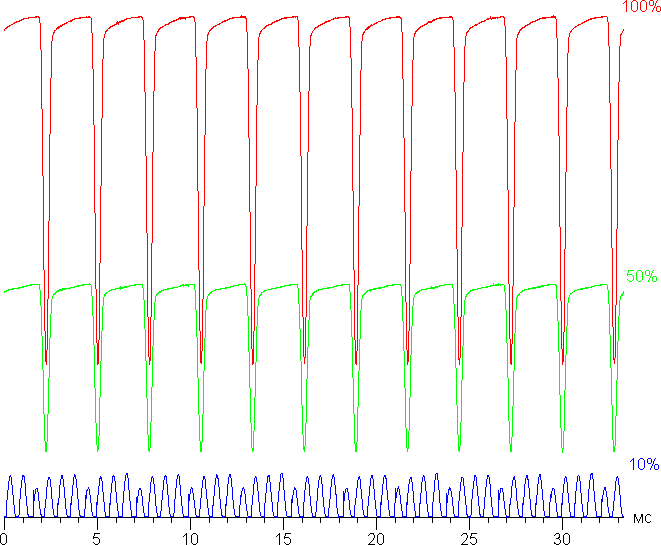 На высоком и среднем уровне яркости присутствует значимая модуляция с частотой 360 Гц. На рисунках ниже приведены зависимости яркости (вертикальная ось) от времени (горизонтальная ось) для нескольких значений настройки яркости: