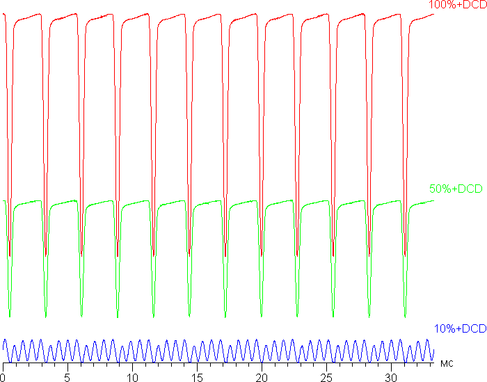 В англоязычной литературе и в новостях обычно используют название DC Dimming (на графиках сократим до DCD). При включении этой функции меняется только характер модуляции на низкой яркости. Видимого мерцания как не было, так и нет: