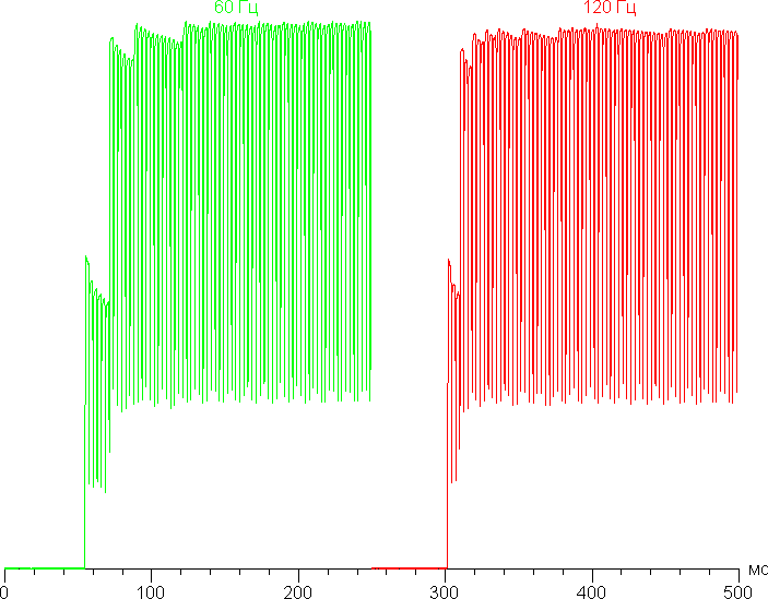 Характер модуляции при этом не изменился. Отметим, что на статических изображениях, судя по характеру зависимости яркости от времени, частота обновления может снижаться до 10 Гц, независимо от выбранного значения настройки на снимке выше.