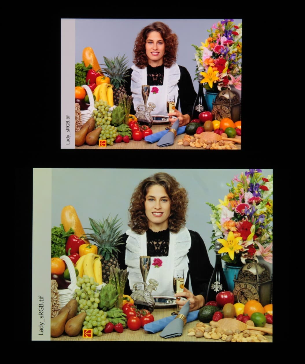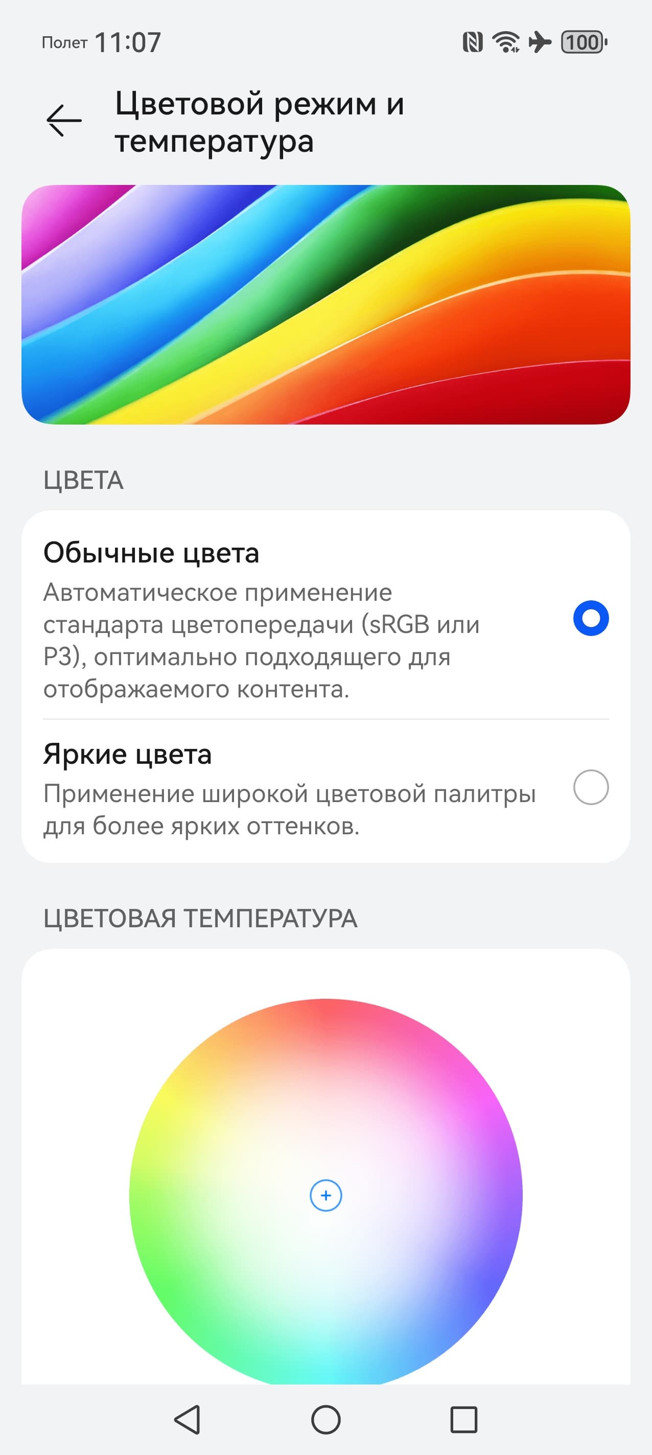Отметим, что на экранах с уширенным цветовым охватом (без соответствующей коррекции) цвета́ обычных изображений, оптимизированных для устройств sRGB, выглядят неестественно насыщенными. Отсюда и рекомендация: в большинстве случаев смотреть кино, фотографии и все естественное лучше при выборе профиля Обычные цвета. При этом, если в изображении прописан отличный от sRGB профиль, то смотреть его лучше с использованием штатной программы Галерея.