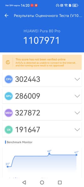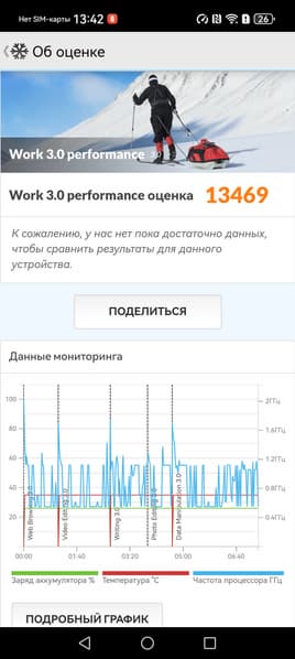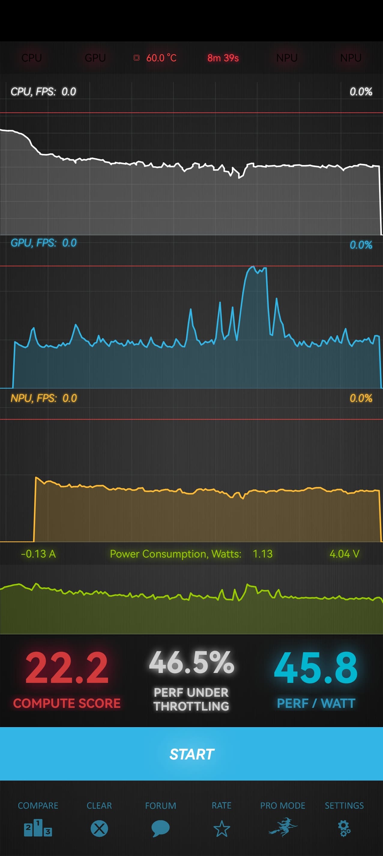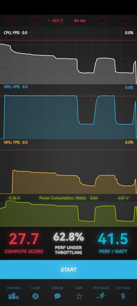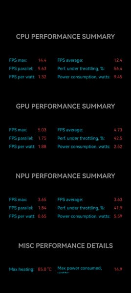 Тест на снижение производительности при нагреве мы проводим с помощью программы Burnout Benchmark, которая позволяет нагружать CPU, GPU и NPU. Сначала результаты теста в обычном режиме: