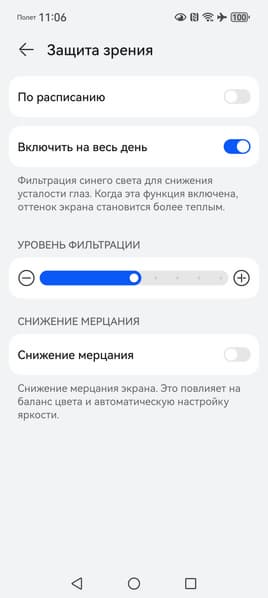 Разумеется есть функция снижения интенсивности синей компоненты. В принципе, яркий свет может приводить к нарушению суточного (циркадного) ритма (см. статью про iPad Pro с дисплеем 9,7 дюйма), но все решается снижением яркости до низкого, но еще комфортного уровня, а искажать цветовой баланс, уменьшая вклад синего, нет абсолютно никакого смысла.