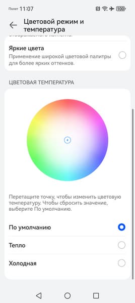 В этом устройстве есть возможность скорректировать цветовой баланс с помощью выбора профиля цветовой температуры или регулировки оттенка на цветовом круге.