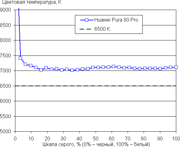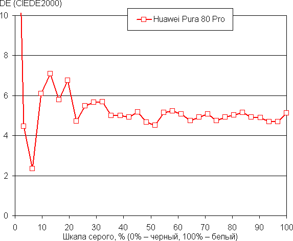 Напомним, что в случае OLED-экранов яркость фрагментов изображения динамично меняется в соответствии с характером выводимого изображения — чуть уменьшается для светлых в целом изображений. В итоге полученная зависимость яркости от оттенка (гамма-кривая), скорее всего, не соответствует гамма-кривой статичного изображения, так как измерения проводились при последовательном выводе оттенков серого почти на весь экран.
