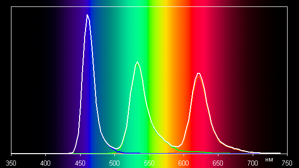 В первом случае спектры компонент (то есть спектры чистых красного, зеленого и синего цветов) очень хорошо разделены: