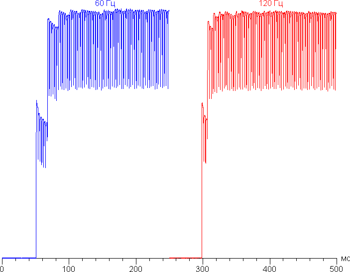 Переключение состояния элементов матрицы выполняется практически мгновенно, но на фронте включения может присутствовать ступенька шириной примерно 17 мс (что соответствует частоте обновления экрана примерно в 60 Гц) или примерно 8 мс (120 Гц). Например, так выглядит зависимость яркости от времени при переходе от черного к белому: