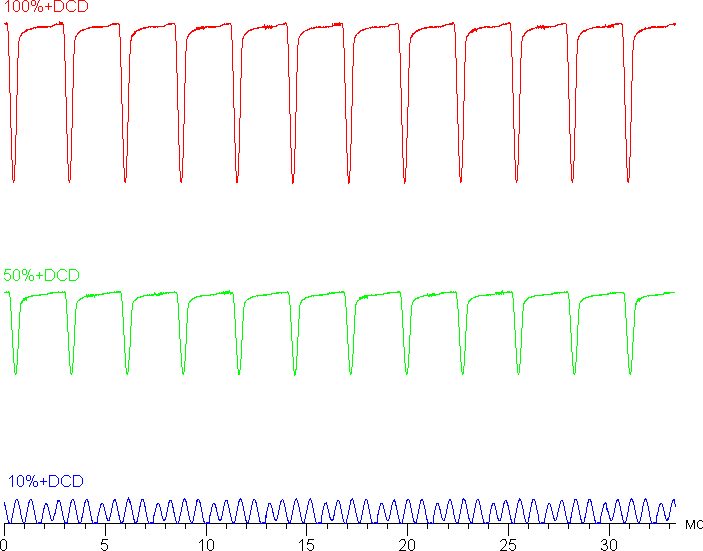 В англоязычной литературе и в новостях обычно используют название DC Dimming (на графиках сократим до DCD). При включении этой функции меняется только характер модуляции на низкой яркости. Видимого мерцания как не было, так и нет. Приведем графики: