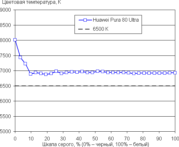 Напомним, что в случае OLED-экранов яркость фрагментов изображения динамично меняется в соответствии с характером выводимого изображения — чуть уменьшается для светлых в целом изображений. В итоге полученная зависимость яркости от оттенка (гамма-кривая), скорее всего, не соответствует гамма-кривой статичного изображения, так как измерения проводились при последовательном выводе оттенков серого почти на весь экран.